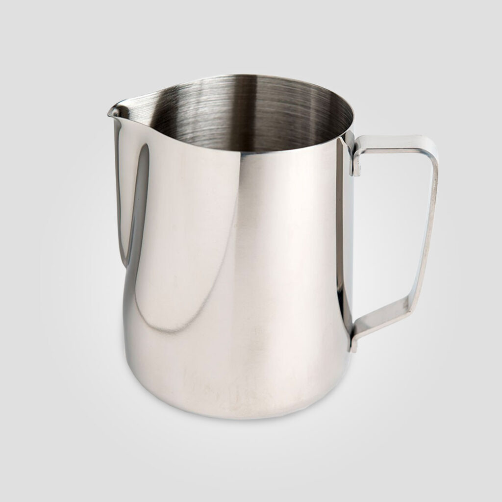 The metal frothing jug allows the barista to hold it at the bottom when frothing milk to easily gauge the milk’s temperature.